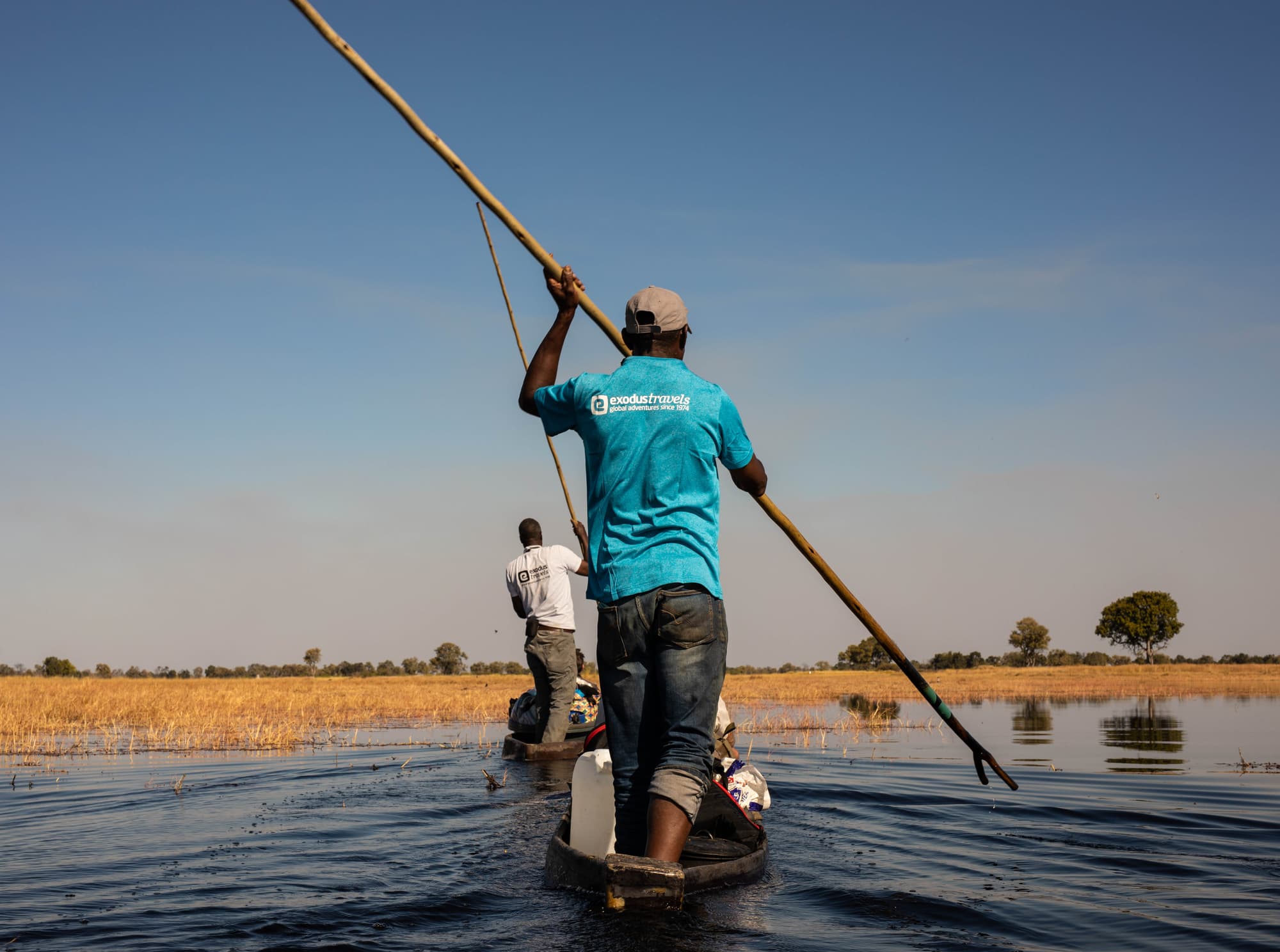 We head into the delta in mokoro dugout canoes poled by local villagers who have grown up here.